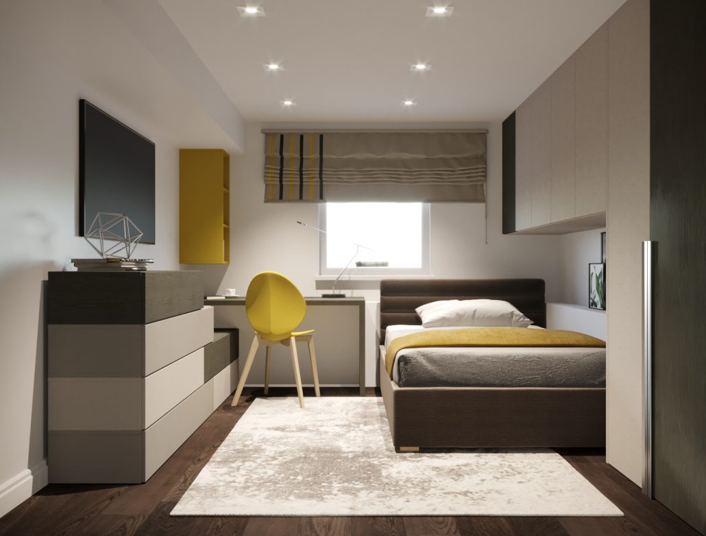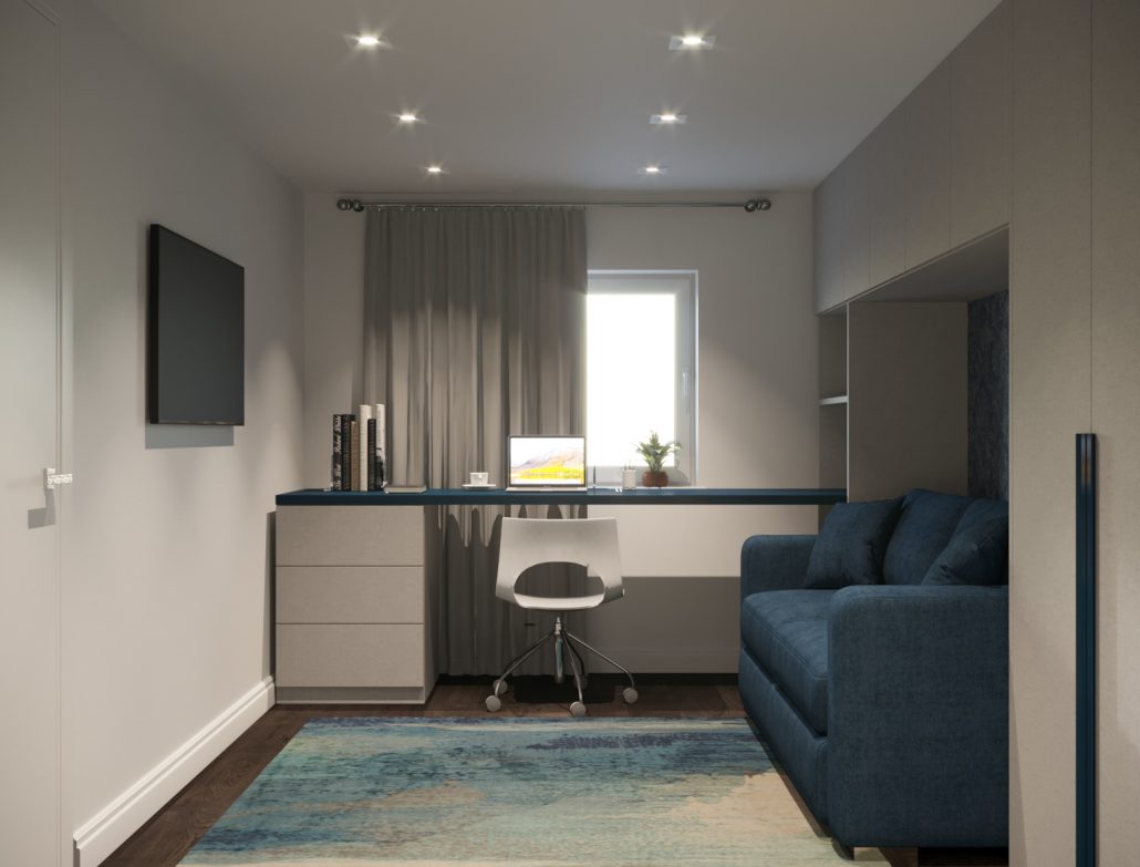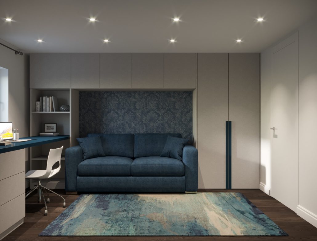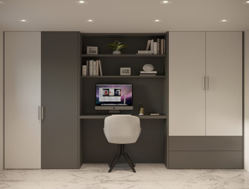 Custom millwork elements organize each room through full-height cabinetry walls, integrated desk systems, and built-in storage solutions. Bedroom millwork combines overhead cabinetry with integrated bed niches and adjacent wardrobes to maximize storage while maintaining clear wall compositions. In secondary rooms and workspace areas, desk surfaces are integrated with shelving and storage cabinetry to create compact yet structured work environments. Living areas incorporate low-profile storage walls and display shelving designed to integrate with surrounding architectural conditions while maintaining visual continuity across the residence.