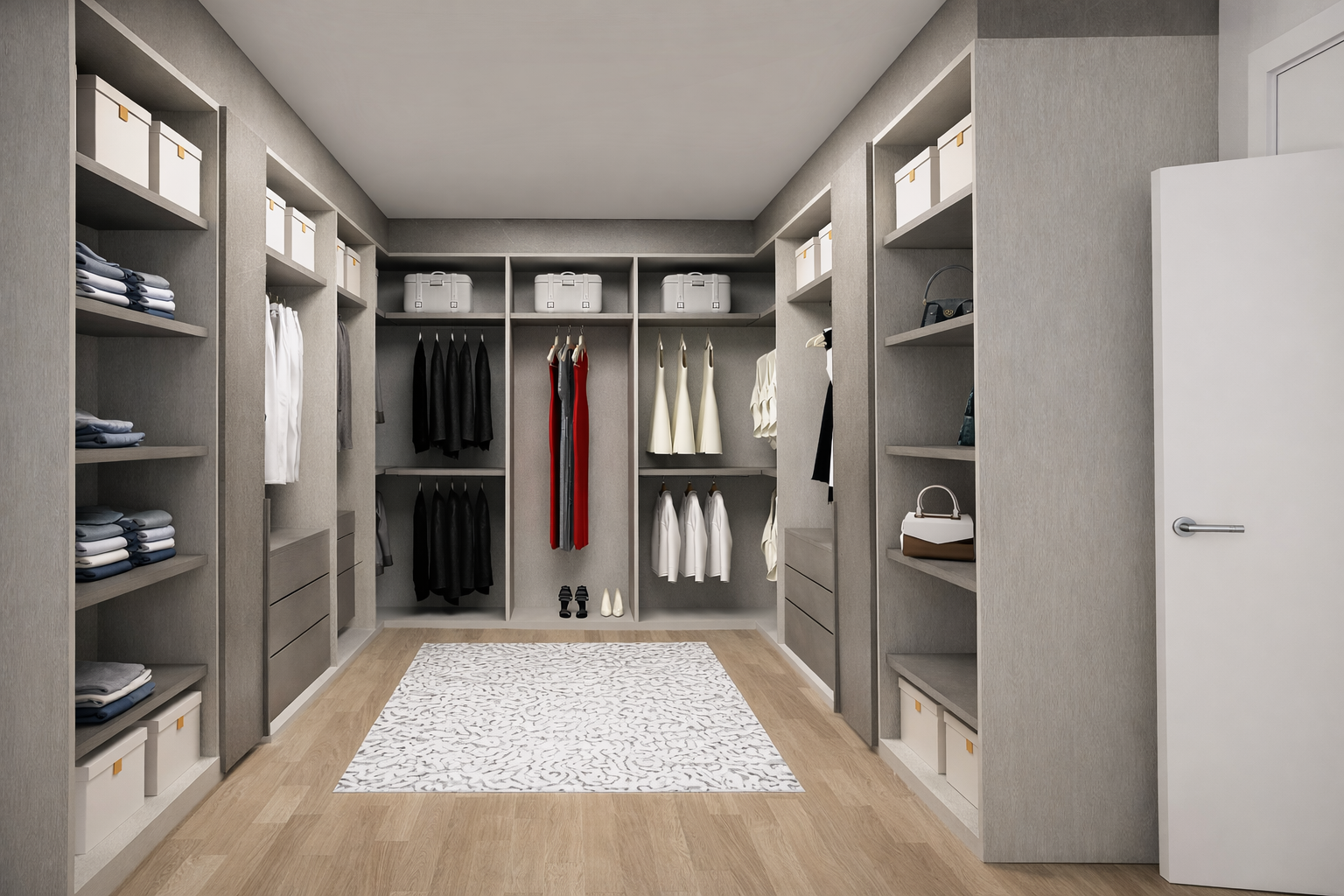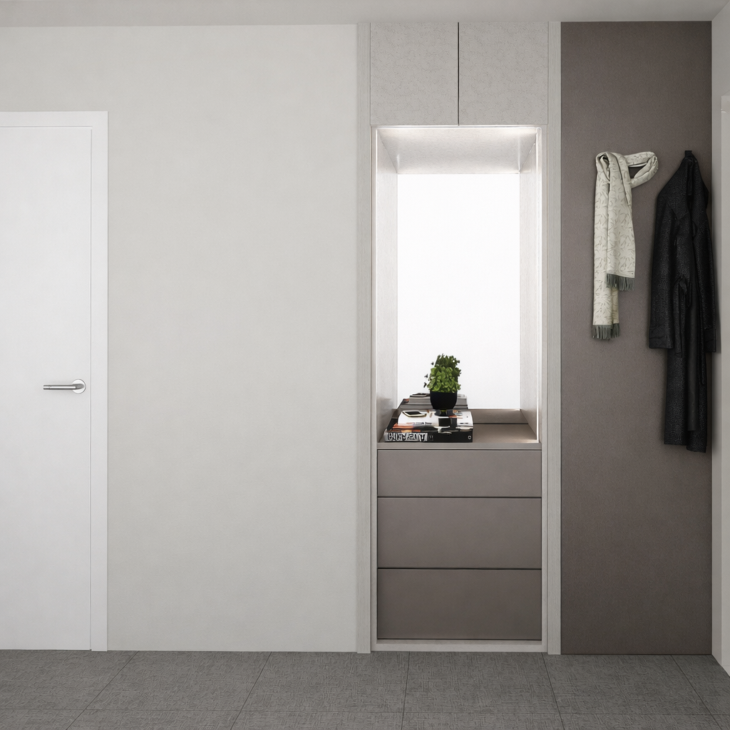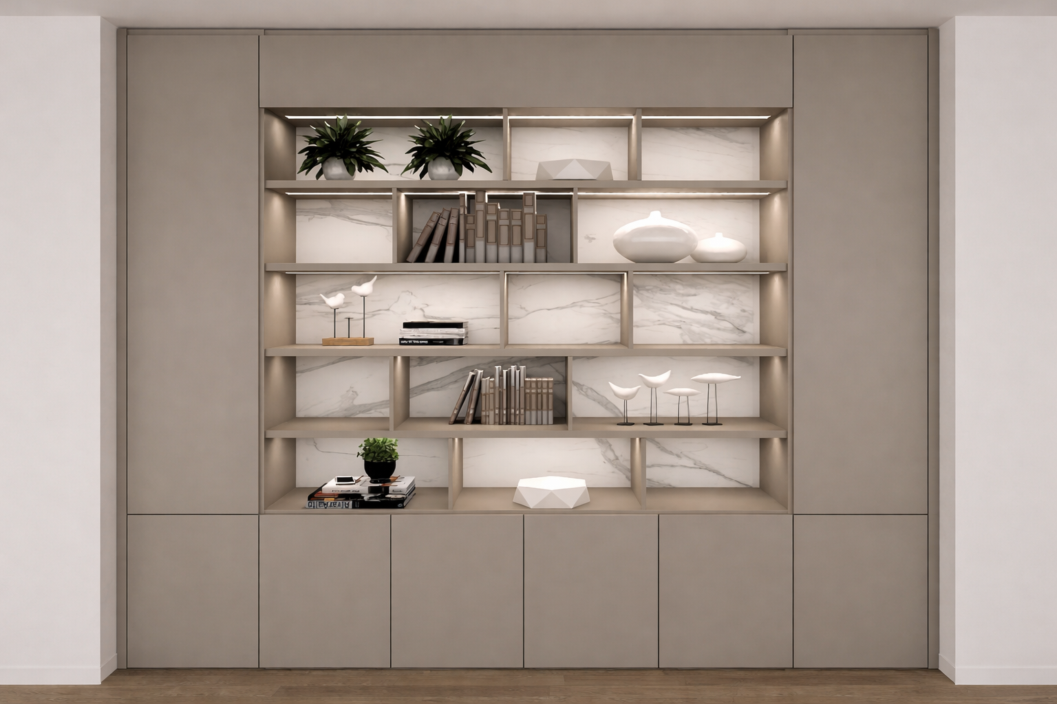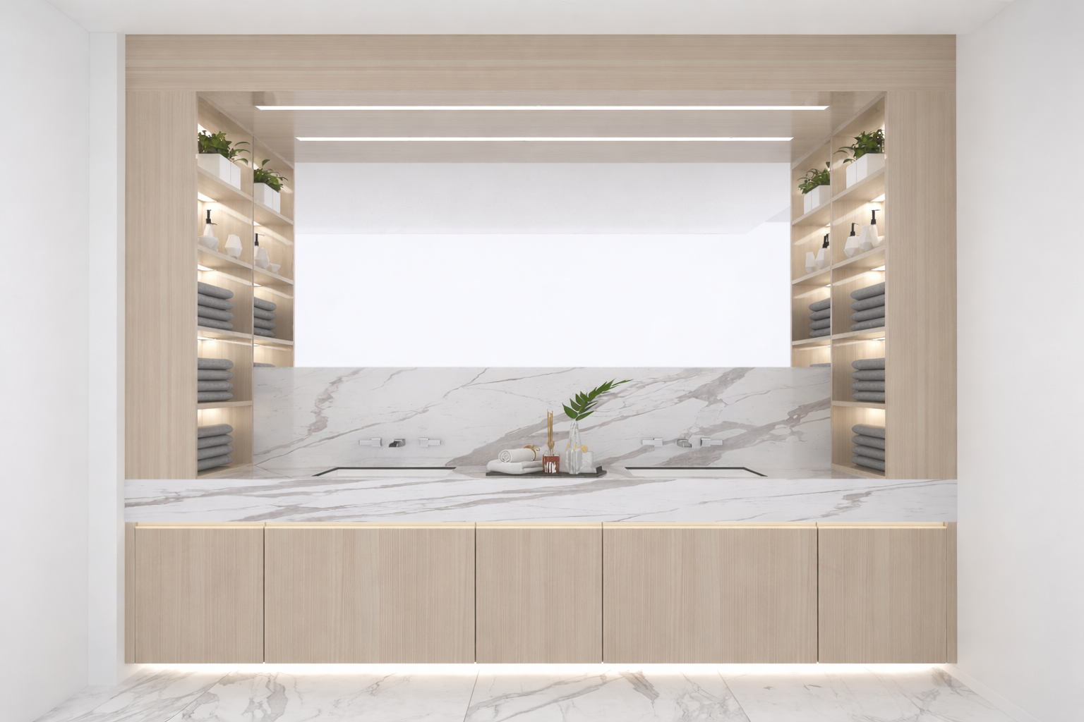 Light oak vertical grain finishes, soft neutral cabinetry tones, and concealed storage systems define the interior millwork language. Integrated lighting and full-height installations reinforce spatial alignment while maintaining a restrained visual presence. The result is a residence where cabinetry functions as both structure and refinement within the overall architectural envelope.