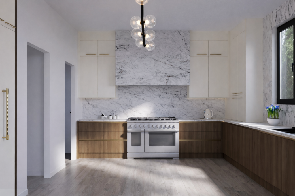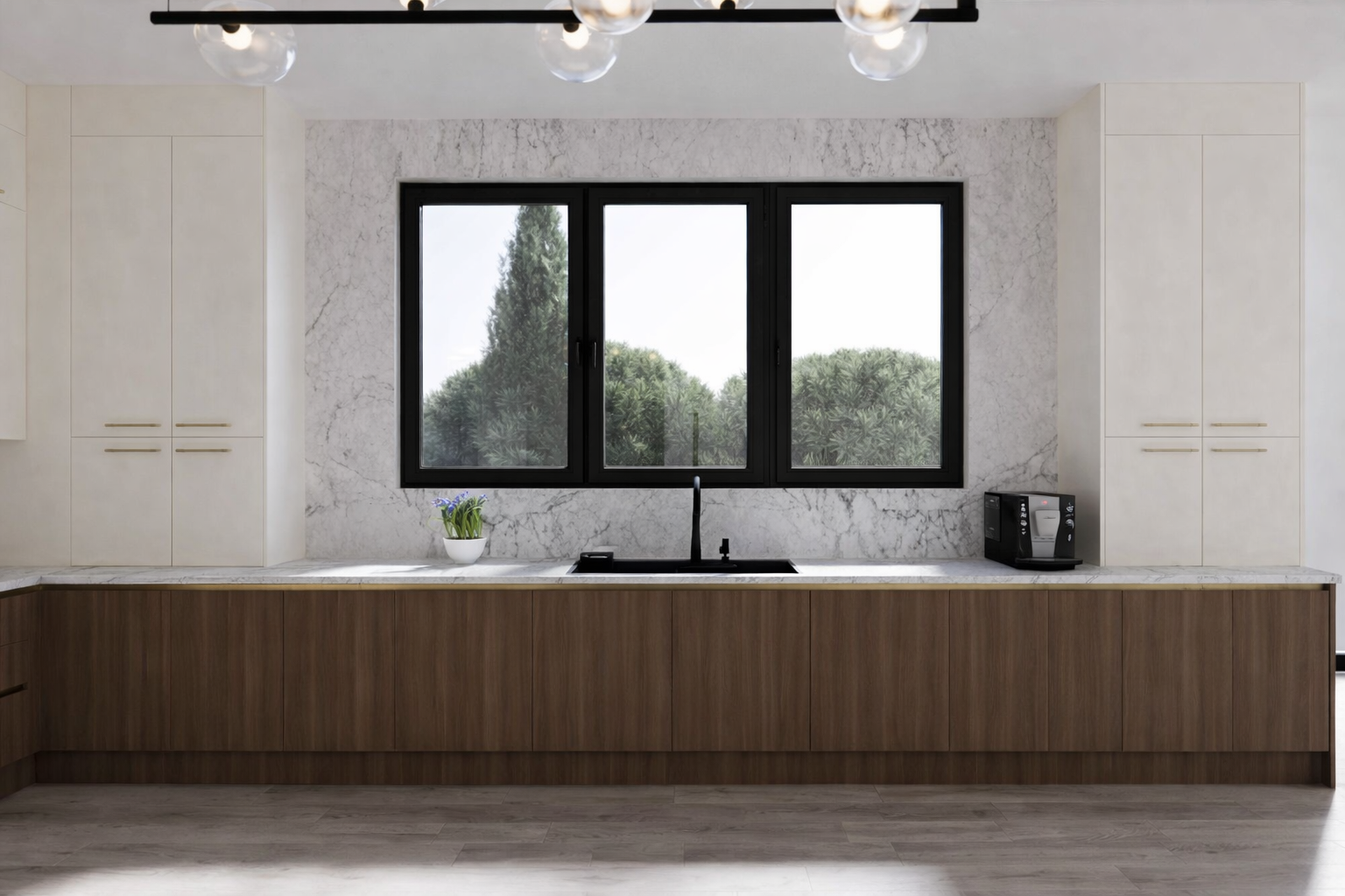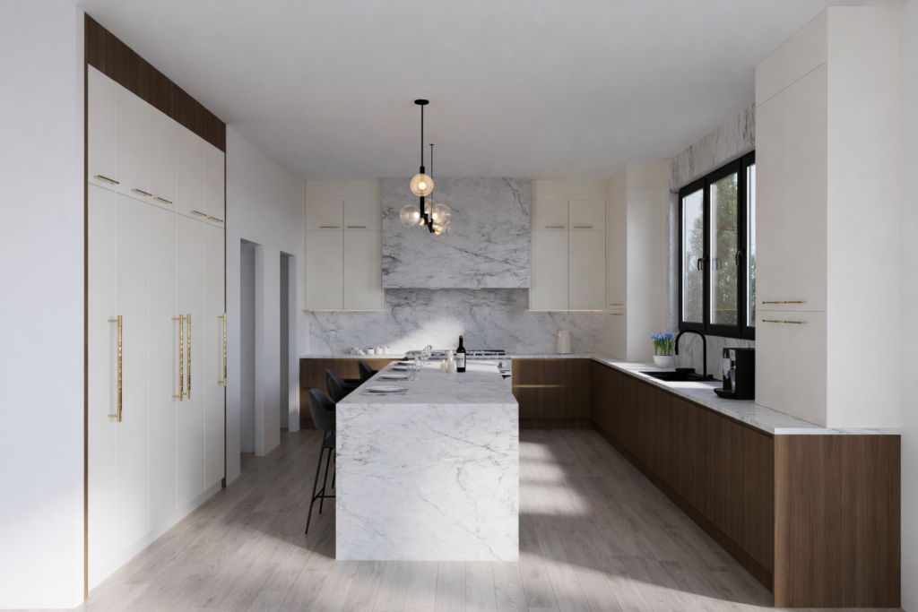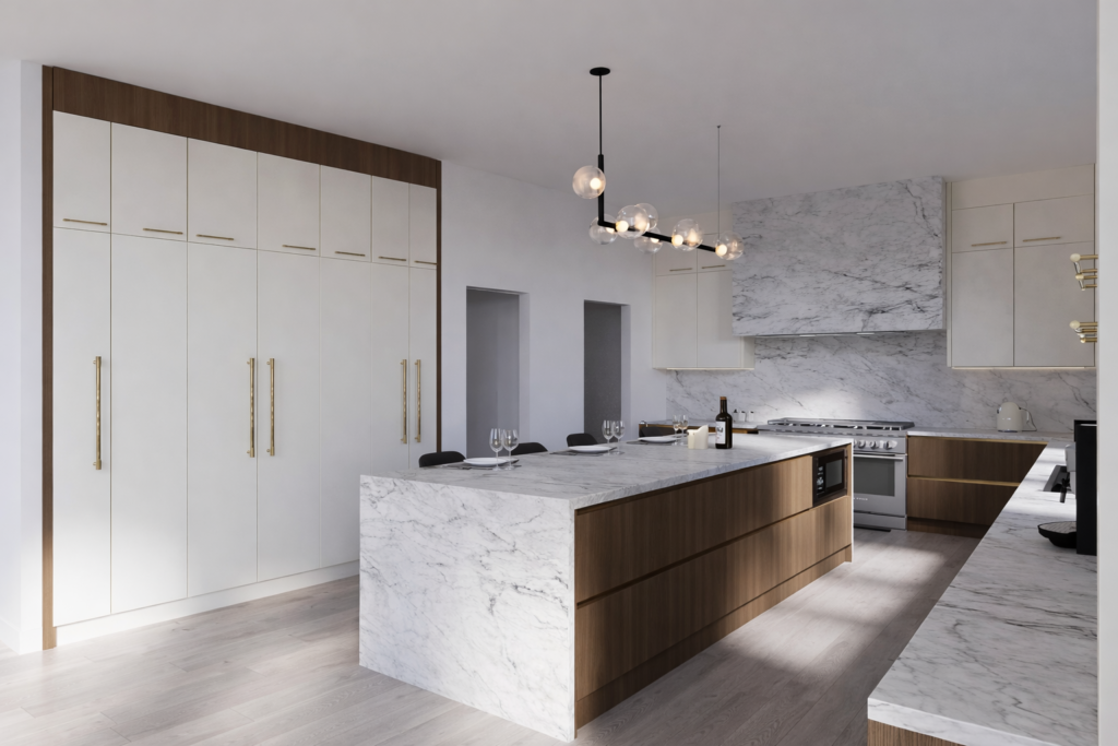The kitchen is organized around a large central island supported by full-height perimeter cabinetry and integrated storage systems. Warm wood base cabinetry contrasts with matte upper cabinets to maintain visual balance while preserving a disciplined architectural layout. Panel-ready appliance integration allows the cabinetry system to maintain uninterrupted lines across primary elevations. Stone surfaces visible within the kitchen were coordinated with other trades to align precisely with the millwork systems.