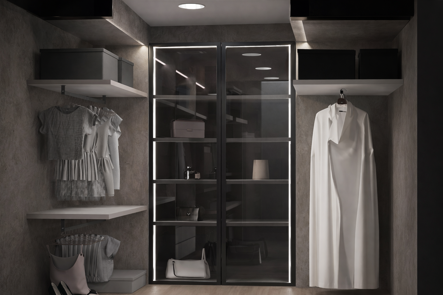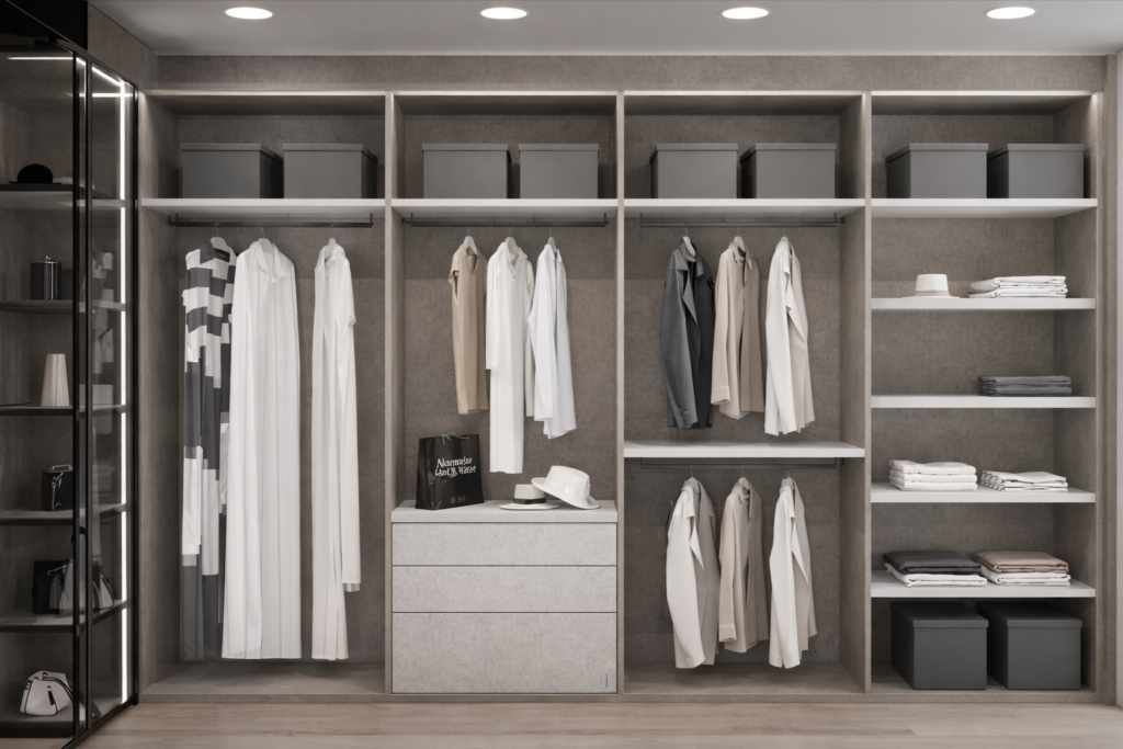 Walk-in wardrobe systems with shelving, drawers, and hanging zones