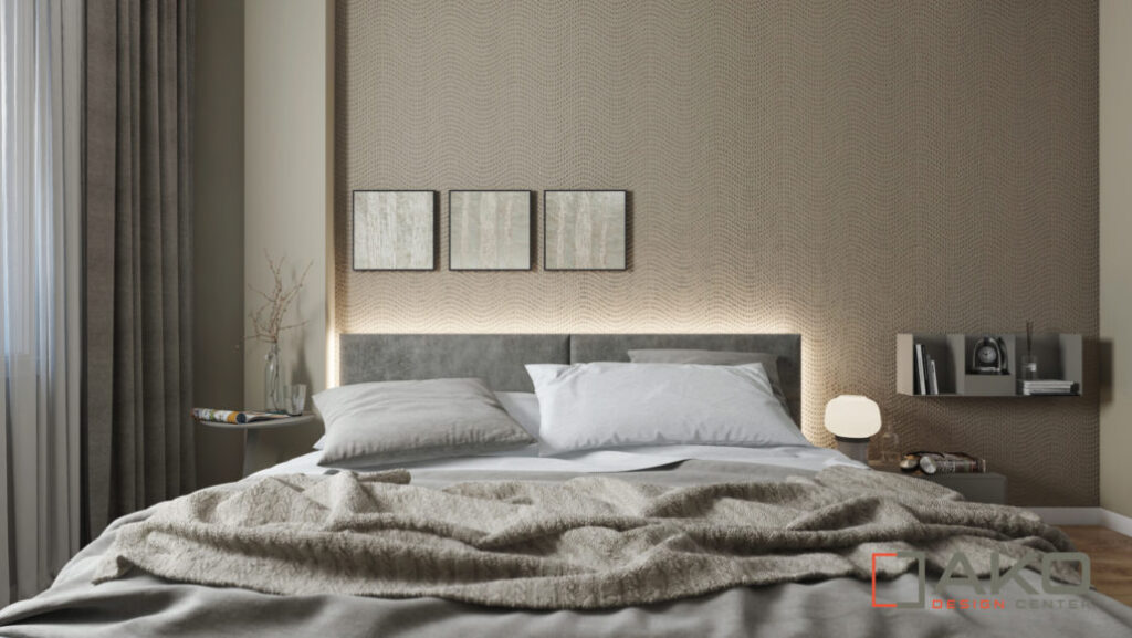 In the main living area, a full-height media wall integrates concealed storage with open display shelving and recessed lighting, creating a continuous cabinetry composition across the room’s primary elevation. The bedroom incorporates minimal bedside millwork and floating shelving elements that maintain visual continuity with the apartment’s overall material palette. In the home office, a custom desk system combines integrated shelving, overhead storage, and built-in cabinetry to organize the workspace within a compact footprint. Across the apartment, millwork elements were fabricated to align precisely with wall conditions and architectural openings, ensuring a consistent installation across multiple rooms.